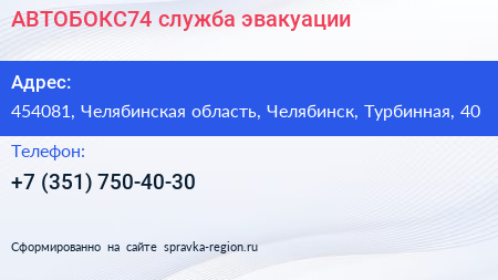 АВТОБОКС74, служба эвакуации по адресу 454081, Челябинская область, Челябинск, Турбинная, 40 в дальнейшем Организация, размещена в следующих категориях: