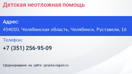 Детская неотложная помощь по адресу 454010, Челябинская область, Челябинск, Руставели, 16 в дальнейшем Организация, размещена в следующих категориях: