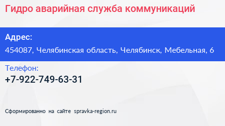 Гидро, аварийная служба коммуникаций по адресу 454087, Челябинская область, Челябинск, Мебельная, 6 в дальнейшем Организация, размещена в следующих категориях:
