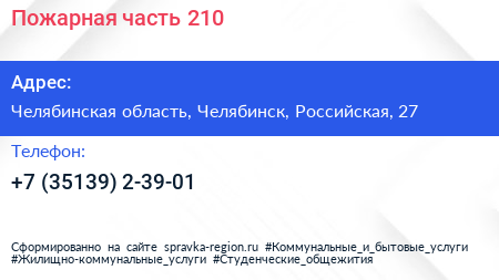 Пожарная часть №210 по адресу Челябинская область, Челябинск, Российская, 27 в дальнейшем Организация, размещена в следующих категориях: