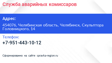 Служба аварийных комиссаров по адресу 454076, Челябинская область, Челябинск, Скульптора Головницкого, 14 в дальнейшем Организация, размещена в следующих категориях:
