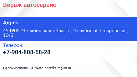 Вираж, автосервис по адресу 454902, Челябинская область, Челябинск, Покровская, 10/3 в дальнейшем Организация, размещена в следующих категориях:
