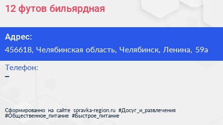 12 футов, бильярдная по адресу 456618, Челябинская область, Челябинск, Ленина, 59а в дальнейшем Организация, размещена в следующих категориях: