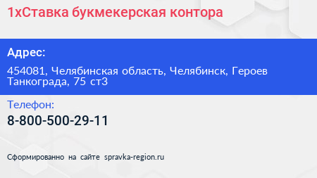 1хСтавка, букмекерская контора по адресу 454081, Челябинская область, Челябинск, Героев Танкограда, 75 ст3 в дальнейшем Организация, размещена в следующих категориях: