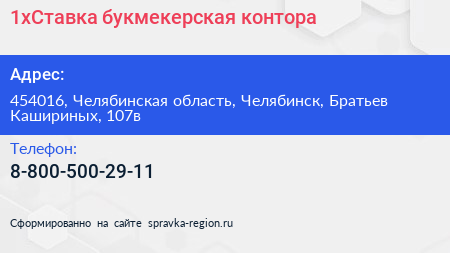 1хСтавка, букмекерская контора по адресу 454016, Челябинская область, Челябинск, Братьев Кашириных, 107в в дальнейшем Организация, размещена в следующих категориях: