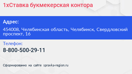 1хСтавка, букмекерская контора по адресу 454008, Челябинская область, Челябинск, Свердловский проспект, 16 в дальнейшем Организация, размещена в следующих категориях: