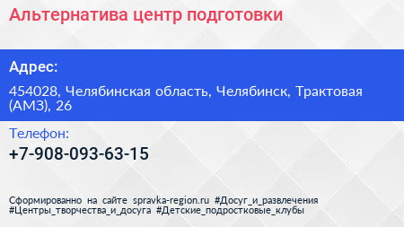 Альтернатива, центр подготовки по адресу 454028, Челябинская область, Челябинск, Трактовая (АМЗ), 26 в дальнейшем Организация, размещена в следующих категориях: