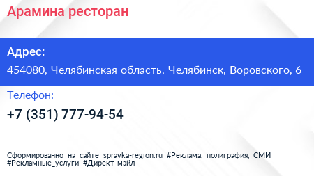 Арамина, ресторан по адресу 454080, Челябинская область, Челябинск, Воровского, 6 в дальнейшем Организация, размещена в следующих категориях: