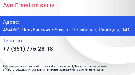 Ave Freedom, кафе по адресу 454090, Челябинская область, Челябинск, Свободы, 141 в дальнейшем Организация, размещена в следующих категориях: