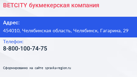 BETCITY, букмекерская компания по адресу 454010, Челябинская область, Челябинск, Гагарина, 29 в дальнейшем Организация, размещена в следующих категориях: