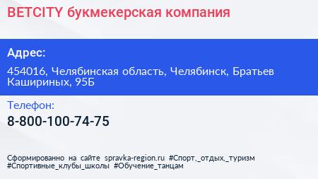 BETCITY, букмекерская компания по адресу 454016, Челябинская область, Челябинск, Братьев Кашириных, 95Б в дальнейшем Организация, размещена в следующих категориях: