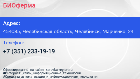 БИОферма по адресу 454085, Челябинская область, Челябинск, Марченко, 24 в дальнейшем Организация, размещена в следующих категориях: