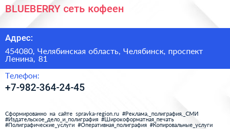 BLUEBERRY, сеть кофеен по адресу 454080, Челябинская область, Челябинск, проспект Ленина, 81 в дальнейшем Организация, размещена в следующих категориях: