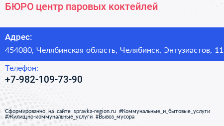 БЮРО, центр паровых коктейлей по адресу 454080, Челябинская область, Челябинск, Энтузиастов, 11 в дальнейшем Организация, размещена в следующих категориях: