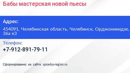 Бабы, мастерская новой пьесы по адресу 454091, Челябинская область, Челябинск, Орджоникидзе, 36а к3 в дальнейшем Организация, размещена в следующих категориях: