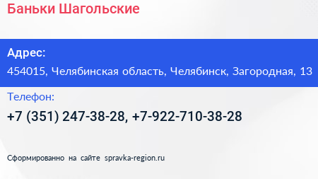 Баньки Шагольские по адресу 454015, Челябинская область, Челябинск, Загородная, 13 в дальнейшем Организация, размещена в следующих категориях: