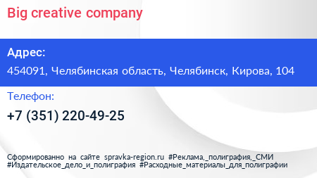 Big creative company по адресу 454091, Челябинская область, Челябинск, Кирова, 104 в дальнейшем Организация, размещена в следующих категориях: