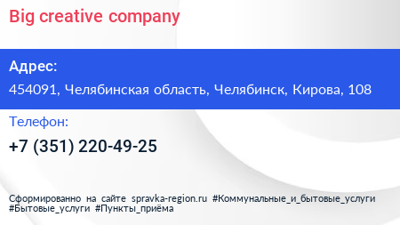 Big creative company по адресу 454091, Челябинская область, Челябинск, Кирова, 108 в дальнейшем Организация, размещена в следующих категориях: