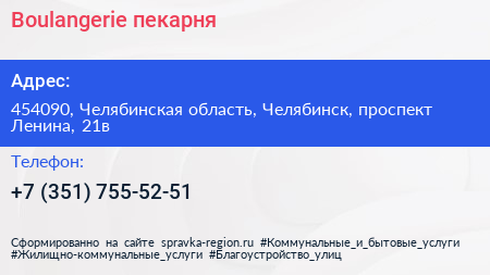 Boulangerie, пекарня по адресу 454090, Челябинская область, Челябинск, проспект Ленина, 21в в дальнейшем Организация, размещена в следующих категориях: