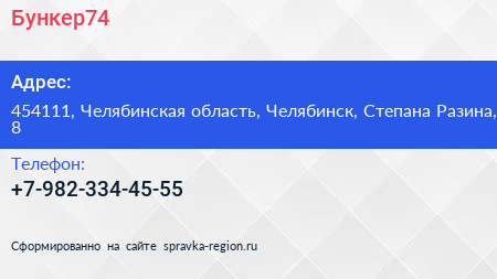 Бункер74 по адресу 454111, Челябинская область, Челябинск, Степана Разина, 8 в дальнейшем Организация, размещена в следующих категориях: