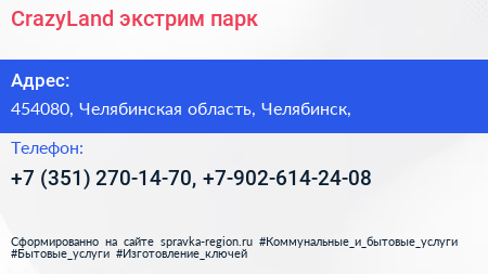 CrazyLand, экстрим-парк по адресу 454080, Челябинская область, Челябинск, в дальнейшем Организация, размещена в следующих категориях: