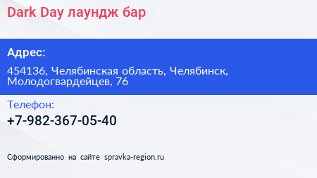 Dark Day, лаундж-бар по адресу 454136, Челябинская область, Челябинск, Молодогвардейцев, 76 в дальнейшем Организация, размещена в следующих категориях: