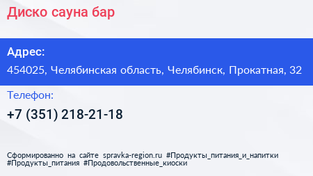 Диско, сауна-бар по адресу 454025, Челябинская область, Челябинск, Прокатная, 32 в дальнейшем Организация, размещена в следующих категориях: