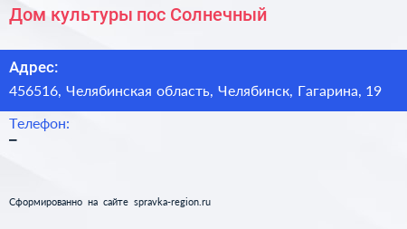 Дом культуры, пос. Солнечный по адресу 456516, Челябинская область, Челябинск, Гагарина, 19 в дальнейшем Организация, размещена в следующих категориях: