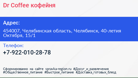 Dr.Coffee, кофейня по адресу 454007, Челябинская область, Челябинск, 40-летия Октября, 15/1 в дальнейшем Организация, размещена в следующих категориях: