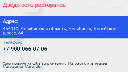 Дзёдо, сеть ресторанов по адресу 454010, Челябинская область, Челябинск, Копейское шоссе, 64 в дальнейшем Организация, размещена в следующих категориях: