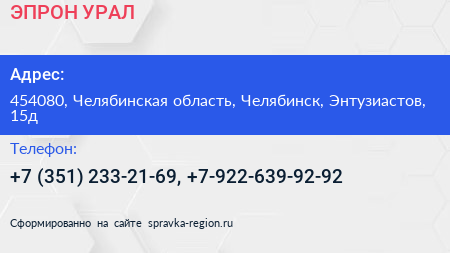 ЭПРОН-УРАЛ по адресу 454080, Челябинская область, Челябинск, Энтузиастов, 15д в дальнейшем Организация, размещена в следующих категориях: