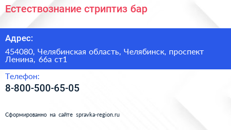 Естествознание, стриптиз-бар по адресу 454080, Челябинская область, Челябинск, проспект Ленина, 66а ст1 в дальнейшем Организация, размещена в следующих категориях: