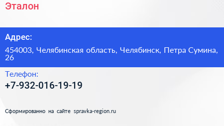 Эталон по адресу 454003, Челябинская область, Челябинск, Петра Сумина, 26 в дальнейшем Организация, размещена в следующих категориях: