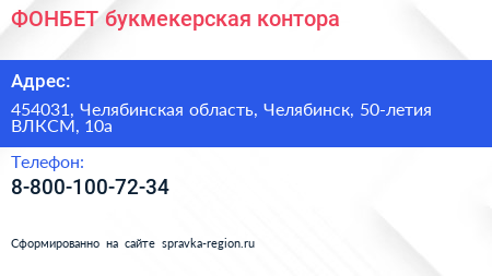 ФОНБЕТ, букмекерская контора по адресу 454031, Челябинская область, Челябинск, 50-летия ВЛКСМ, 10а в дальнейшем Организация, размещена в следующих категориях: