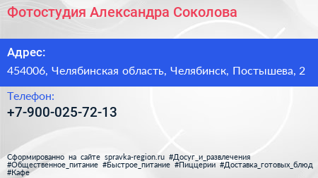 Фотостудия Александра Соколова по адресу 454006, Челябинская область, Челябинск, Постышева, 2 в дальнейшем Организация, размещена в следующих категориях: