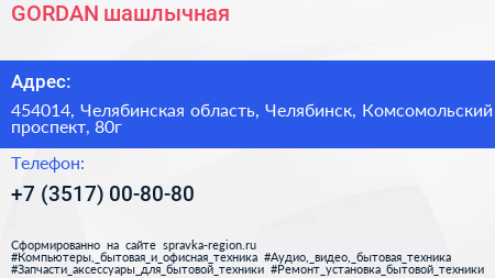 GORDAN, шашлычная по адресу 454014, Челябинская область, Челябинск, Комсомольский проспект, 80г в дальнейшем Организация, размещена в следующих категориях: