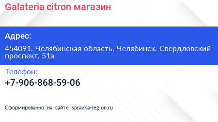 Galateria citron, магазин по адресу 454091, Челябинская область, Челябинск, Свердловский проспект, 51а в дальнейшем Организация, размещена в следующих категориях: