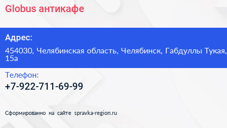 Globus, антикафе по адресу 454030, Челябинская область, Челябинск, Габдуллы Тукая, 15а в дальнейшем Организация, размещена в следующих категориях:
