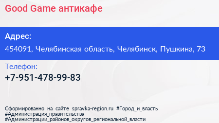 Good Game, антикафе по адресу 454091, Челябинская область, Челябинск, Пушкина, 73 в дальнейшем Организация, размещена в следующих категориях: