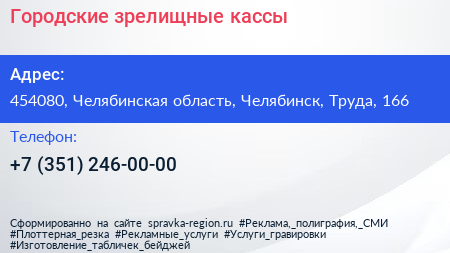 Городские зрелищные кассы по адресу 454080, Челябинская область, Челябинск, Труда, 166 в дальнейшем Организация, размещена в следующих категориях: