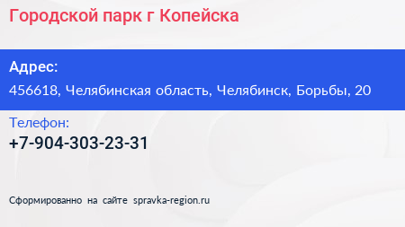 Городской парк г. Копейска по адресу 456618, Челябинская область, Челябинск, Борьбы, 20 в дальнейшем Организация, размещена в следующих категориях: