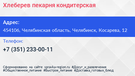 Хлеберев, пекарня-кондитерская по адресу 454106, Челябинская область, Челябинск, Косарева, 12 в дальнейшем Организация, размещена в следующих категориях: