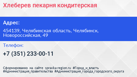 Хлеберев, пекарня-кондитерская по адресу 454139, Челябинская область, Челябинск, Новороссийская, 49 в дальнейшем Организация, размещена в следующих категориях: