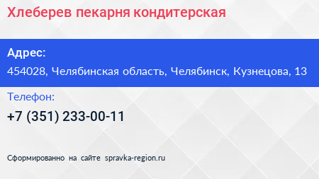 Хлеберев, пекарня-кондитерская по адресу 454028, Челябинская область, Челябинск, Кузнецова, 13 в дальнейшем Организация, размещена в следующих категориях: