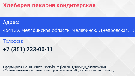 Хлеберев, пекарня-кондитерская по адресу 454139, Челябинская область, Челябинск, Днепровская, 13 в дальнейшем Организация, размещена в следующих категориях:
