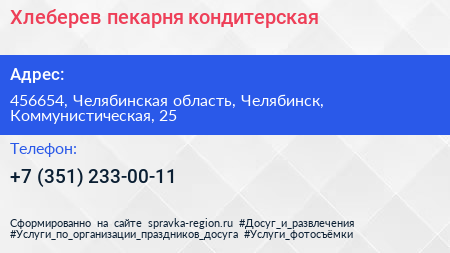 Хлеберев, пекарня-кондитерская по адресу 456654, Челябинская область, Челябинск, Коммунистическая, 25 в дальнейшем Организация, размещена в следующих категориях: