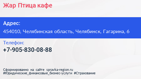 Жар-Птица, кафе по адресу 454010, Челябинская область, Челябинск, Гагарина, 6 в дальнейшем Организация, размещена в следующих категориях: