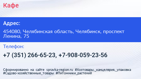 Для связи с организацией воспользуйтесь номером телефона: +7 (351) 266-65-23, +7-908-059-23-56. Пн: c 11:00-17:00, Вт: c 11:00-17:00, Ср: c 11:00-17:00, Чт: c 11:00-17:00, Пт: c 11:00-17:00, Сб: выходной, Вс: выходной. столовая: пн-пт 11:00-15:00, вы можете обратиться в эту организацию.