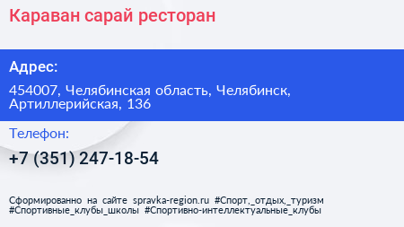 Караван-сарай, ресторан по адресу 454007, Челябинская область, Челябинск, Артиллерийская, 136 в дальнейшем Организация, размещена в следующих категориях: