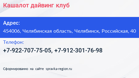 Кашалот, дайвинг-клуб по адресу 454006, Челябинская область, Челябинск, Российская, 40 в дальнейшем Организация, размещена в следующих категориях: